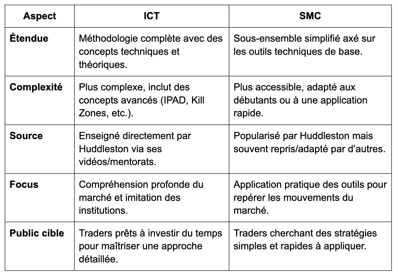 - Définition : SMC est un sous-ensemble ou une simplification des concepts de l’ICT. Il se concentre principalement sur les outils techniques et les principes de base popularisés par Huddleston pour suivre les mouvements du « Smart Money » (institutions).