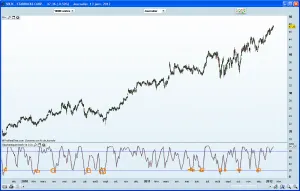 Deuxième solution : acheter chaque fois que le dernier plus haut est cassé à la hausse (j’appelle ça un Break out). On placera un stop loss soit à un prix qui garantit un gain null (pour être even, comme on dit en anglais), soit en dessous du dernier plus bas (le dernier creux). Ce dernier peut signifier une baisse de 20 % ! Il faut donc être confiant. Cela protège d’un retournement de tendance (cf. loi des vagues de Dow). J’ai déjà discuté de ce problème du choix des stop loss dans « Suivi trading automatique au 07 janvier 2012 ou le danger des stop loss ».