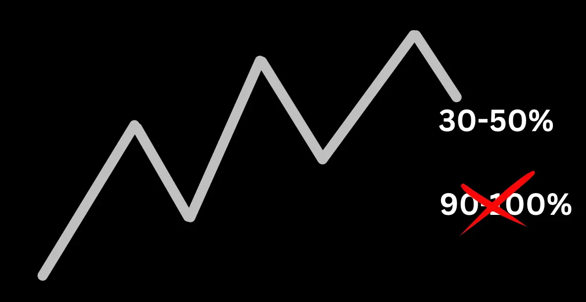 Le trader malin cherche les tendances à fort momentum. Et dans une telle tendance, les prix ne corrigent pas leur dernier swing de 90 ou 100%. Si c’est le cas, cela veut dire que le momentum faiblit, et ce n’est pas bon.